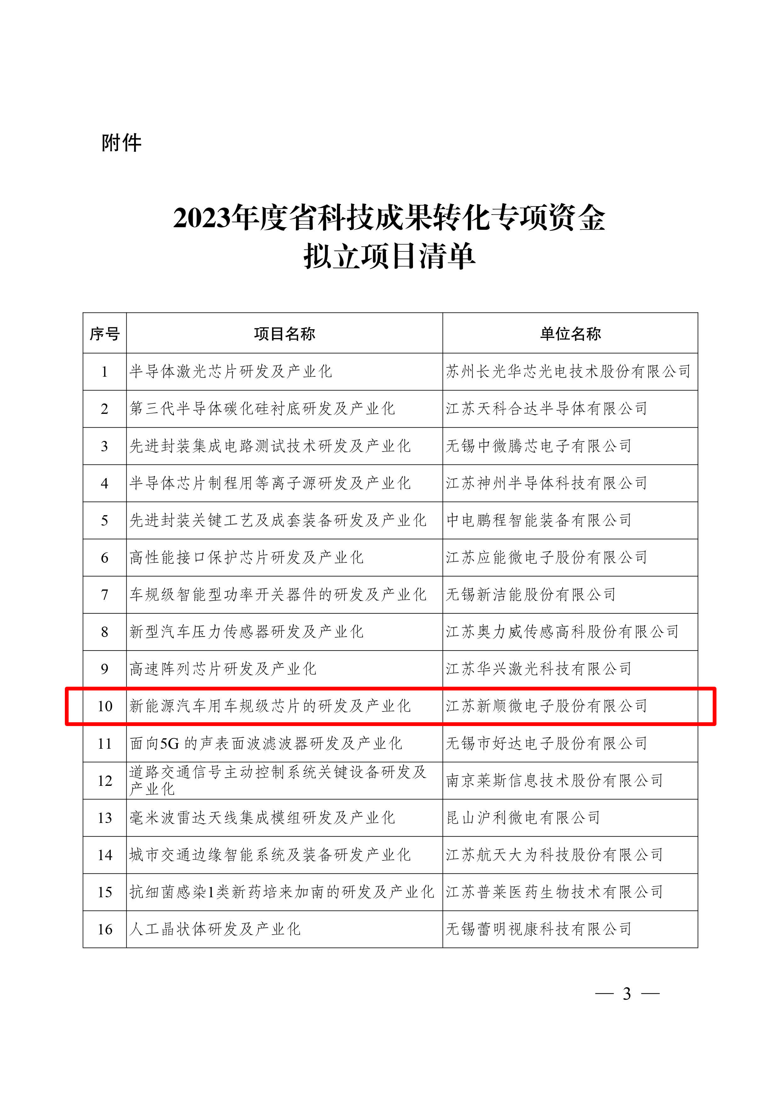 近日,江苏省科学技术厅发布了“2023年度江苏省科技成果转化专项资金拟立项目公示”文件。江苏新顺微电子股份有限公司“新能源汽车用车规级芯片的研发及产业化”项目成功入选!